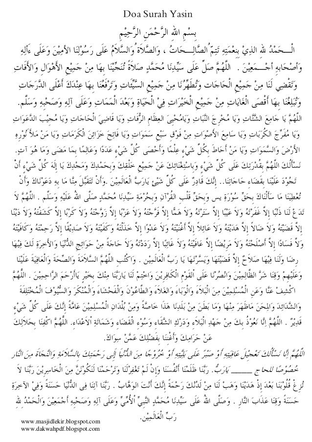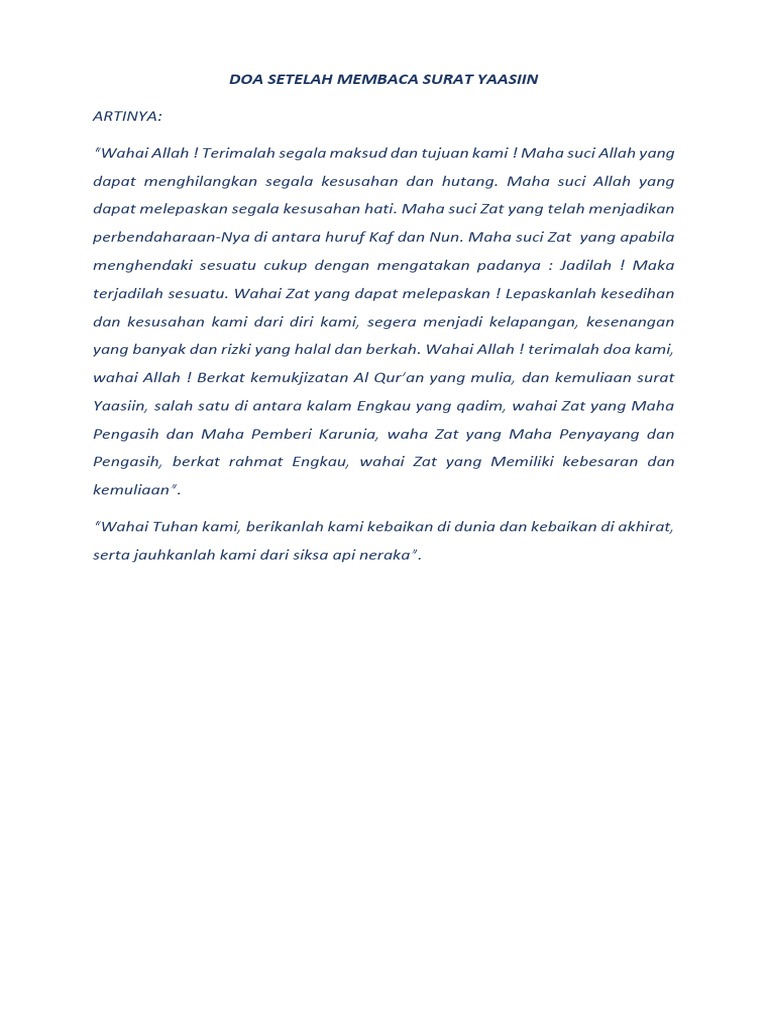 Surat yasin adalah surat al quran yang sangat populer setelah al fatihah. Surat yasin sendiri adalah surat yang sangat luar biasa mulia dan tersimpan banyak sekali manfaat dan keutamaan bagi yang membacanya. Setalah membaca surat yasin dan tahlil dilakukan pembacaan tawasul. Doa setelah membaca yasin, arab, latin dan artinya. Tahlilan sendiri umumnya diisi dengan pembacaan dzikir dan juga surat yasin. 9 bacaan tahlil dan yasin lengkap. Itu adalah pertanyaan wajar dikalangan masyarakat. Inilah doa yang dibaca setelah membaca surat yasin, berisi permohonan kepada allah agar mendapat perlindungan terhadap diri, keluarga, harta, serta segala. Setelah membaca surat yasin, dianjurkan melafalkan doa. Membaca surat yasin setelah selesai melakukan sholat 5 waktu maka permohonan untuk mendapatkan jodoh atau pasangan yang baik itulah ulasan dari pembahasan tentang surat yasin hingga doanya. Doa setelah membaca surat yasin. Surah ini terdiri atas 83 ayat, serta termasuk surat ini menunjuk tentang keimanan seorang muslim. Berikut ini adalah susunan bacaan tahlil singkat.