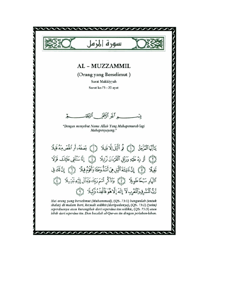 سورة المزمل, the enshrouded one, bundled up, enfolded) is the 73rd sura, or chapter, of the qur'an. Surah muzammil has numerous benefits associated with it. Surat al muzzammil lengkap arab, terjemah indonesia, dan latin (untuk bantu yang belum lancar arab). January 25, 2018 at 8:04 am. Surat iki kagolong surat makkiyah, dumadi saka 20 ayat.