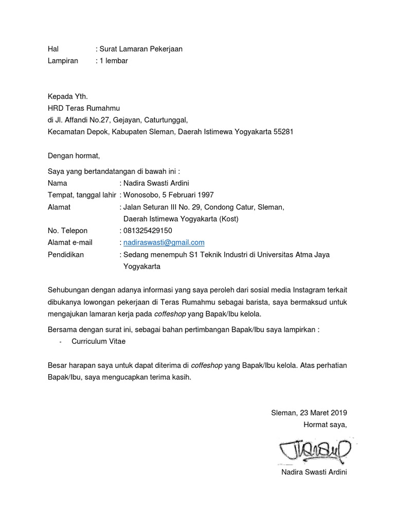Berbagi contoh surat lamaran kerja beserta tips cara membuat surat lamaran pekerjaan yang baik dan benar lengkap dan terbaru. Jadi, dengan uang yang anda dapatkan, anda bisa membiayai kuliah sendiri. Merekomendasikan menu favorit kepada customer; Contoh surat lamaran kerja untuk freshgraduate. Ada beberapa hal yang harus diperhatikan ketika membuat surat lamaran kerja, salah. Akan tetapi, terkadang kita luput bahwa hal yang esensial bukan hanya soal ketertarikan kita pada pekerjaan yang dilamar. Tentu saja salah satu tujuan akhir dari belajar adalah mencari kerja dan artikel kali akan memberikan contoh surat lamaran kerja baik dan benar baik itu umum, khusus. Membuat surat lamaran kerja memang terlihat gampang. Padahal, ada banyak hal yang harus kamu perhatikan. Contoh surat lamaran kerja yang baik dan benar. I have a 1 year experience as an barista staff with xyz cafe. Dokument yang selalu wajib dalam pelamaran kerja iyalah surat lamaran karena sebagai dasar kelengkapan dokument dokument lainnya. Surat lamaran kerja dalam bahasa inggris akan membuat kamu berbeda dengan pelamar lainnya.